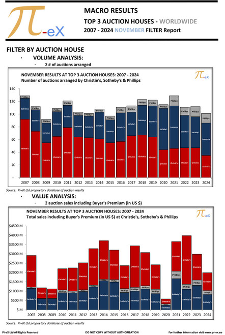 This MACRO Filter Overview Report applies a range of filters to the worldwide auction results in November over the last eighteen years (2007 to 2024) at the three major auction houses (CHRISTIE’S, SOTHEBY’S and PHILLIPS).