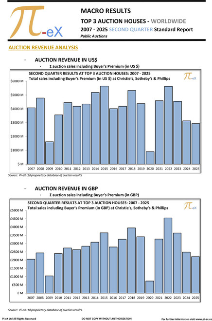 This MACRO Standard Report illustrates the combined worldwide auction results in the Second Quarter of the Calendar Year over the last nineteen years (2007 to 2025) at the three major auction houses (CHRISTIE’S, SOTHEBY’S and PHILLIPS).