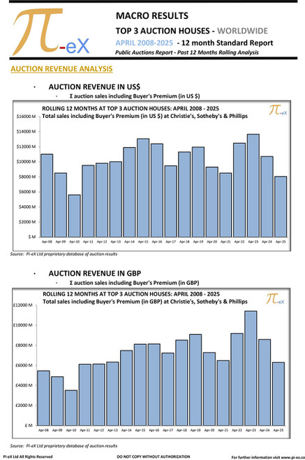 This MACRO Standard Report illustrates the combined worldwide auction results on a 12-month rolling as of end of April 2025 at the three major auction houses ( CHRISTIE’S, SOTHEBY’S and PHILLIPS) over the past 19 years.